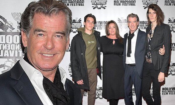 A Brosnan család. Fiaik: Dylan, 20 és Paris, 16 (dailymail.co.uk)