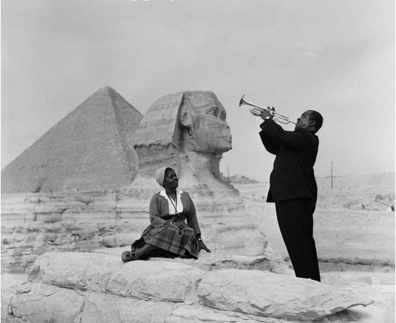 9. Louis Armstrong a feleségének, Lucille Wilsonnak játszik 19 évnyi házasság után Gizában, a piramisok lábánál 1961-ben. Lucill a híres trombitás negyedik felesége volt. Louise három rövid és viharos házasságot tudhatott háta mögött, amikor találkozott Lucillal, aki végül élete asszonya lett. 30 éves, boldog házasságuk Louise Armstrong haláláig tartott.