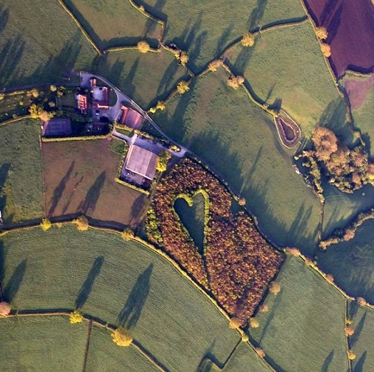 11. Szíverdő egy feleség emlékére: Gyönyörű és megható szív alakú tisztás látható az égből egy emiatt ültetett erdő közepén Angliában. Egy szerető férj titkos emlékhelye ez elhunyt felesége tiszteletére.
