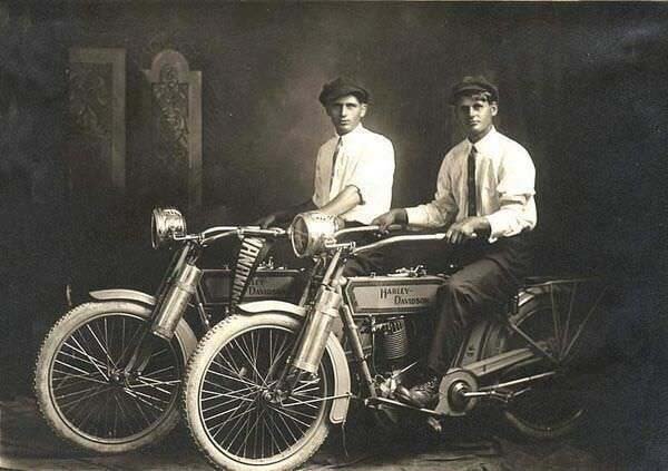 William Harley és Arthur Davidson – 1914. Az alapítók első motorkerékpárjukon.