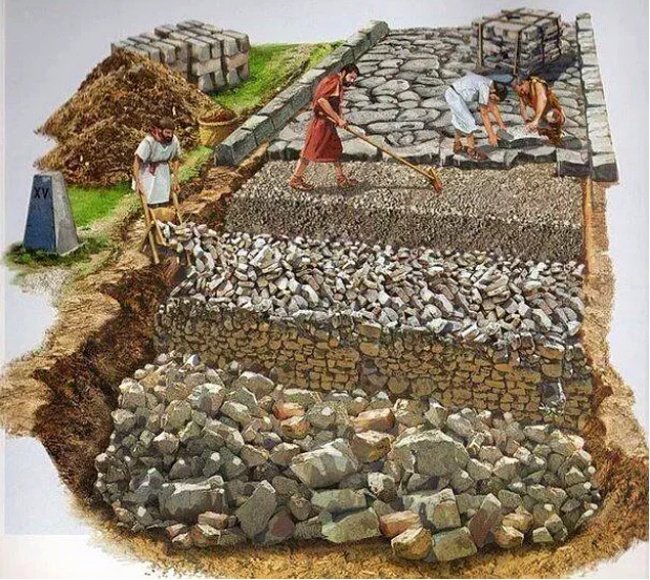 A rajz pontosan bemutatja, hogyan készítették az ókori rómaiak az utat.