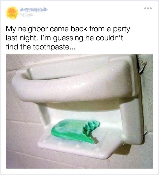 11. “A lakótársam buliról érkezett meg valamikor éjjel. Nem kell sokat találgatni, hogy tudjuk, nem találta a fogkrémet…”