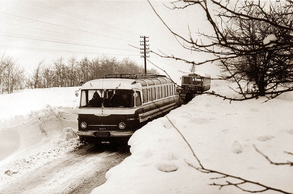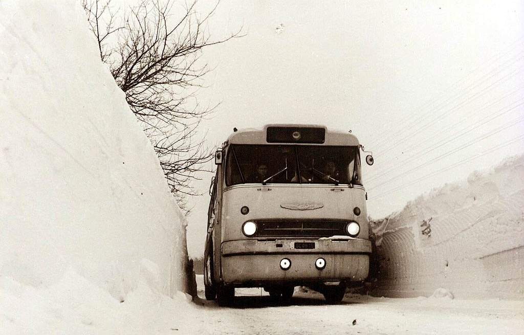 Egy korai faros és egy Ikarus 630-as a hófalak között