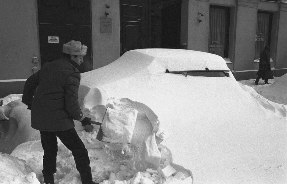 Budapest, 1987. január 14. Egy férfi havat lapátol az utcán hajnalban. Az intenzív havazás miatt az utcán parkoló autókat belepte a hó, a kenyérellátás akadozik. Fotó: Pataki Gábor, MTI