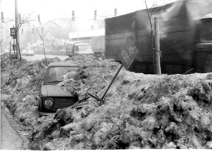 Budapest, 1987. január 12. 30-50 cm-es hó fedi a főváros egyik főútját, szélén egy Skoda személygépkocsi parkol félig behavazva. (Fotó : Baric Imre MTI)